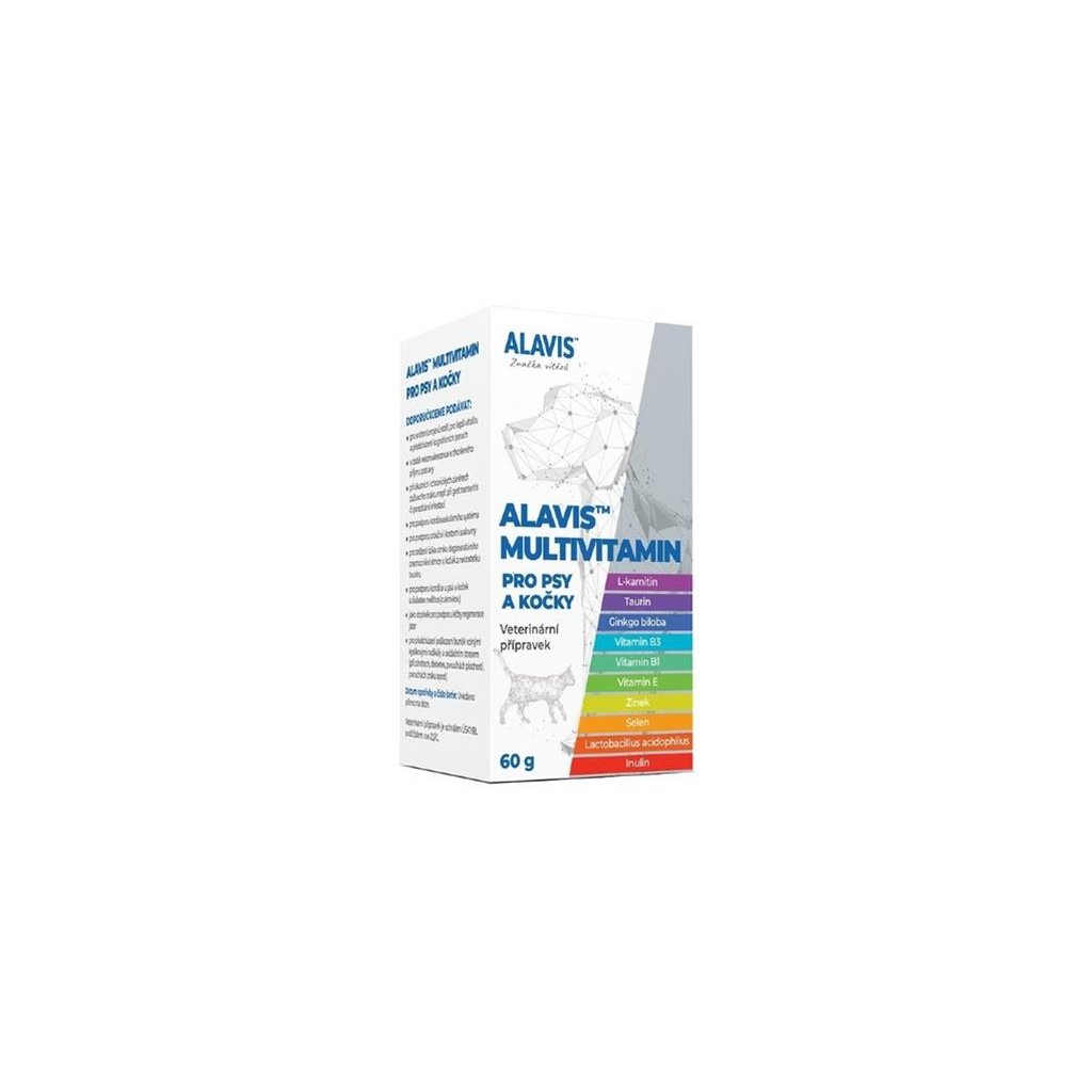 Multivitamín pre psy a mačky (ALAVIS Multivitamín) v prášku. Kombinuje vitamíny a minerály s L-karnitínom, taurínom, probiotikami (Lactobacillus acidophilus) a prebiotikom (inulín) na podporu imunity, vitality a črevného komfortu. Balenie: 60 g.