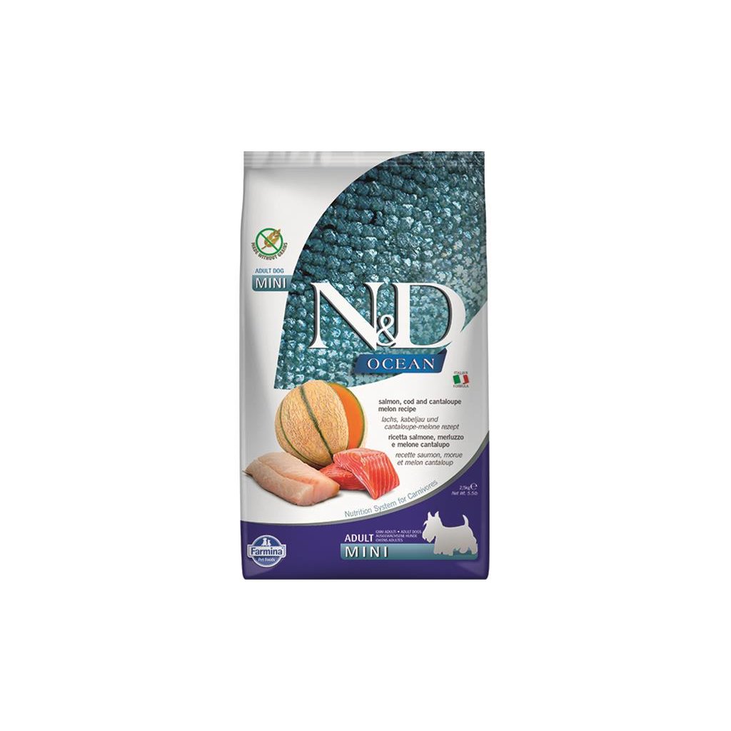 FARMINA N&D – OCEAN (GF) ADULT MINI DOG salmon, cod & cantaloupe melon – Dospelý pes – malé plemená (granule pre psov), 2,5 kg